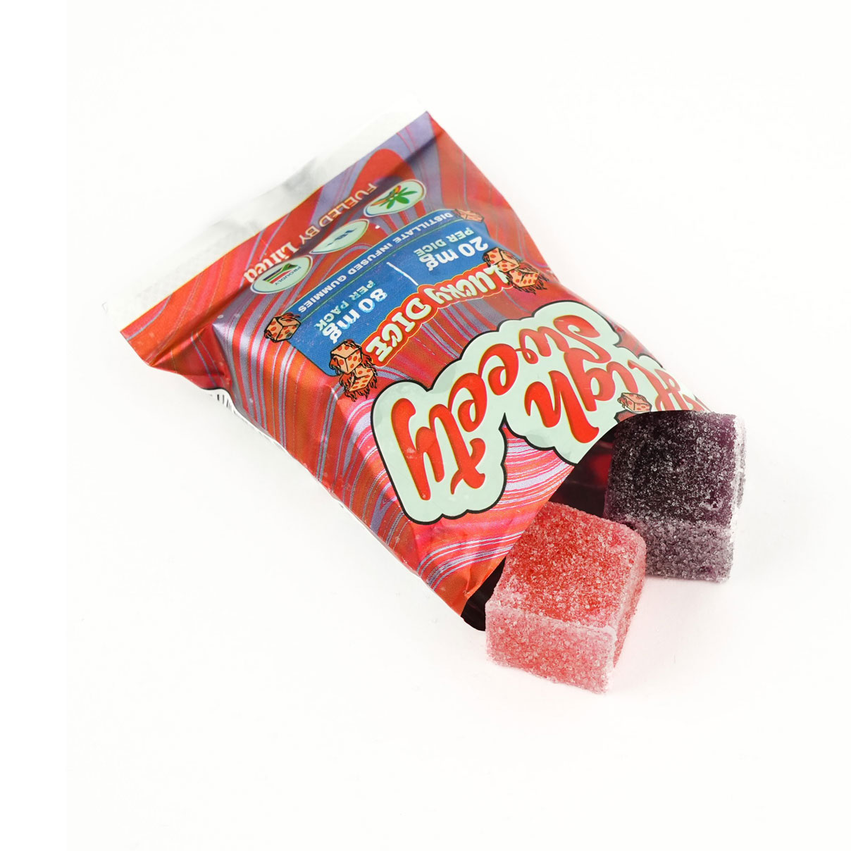 These multi-colored Lucky Dice gummies bring a playful twist to your experience. Each pack contains 4 vibrant dice-shaped gummies (20mg each, 80mg total), perfect for when you want to keep things light, fun, and full of flavor.